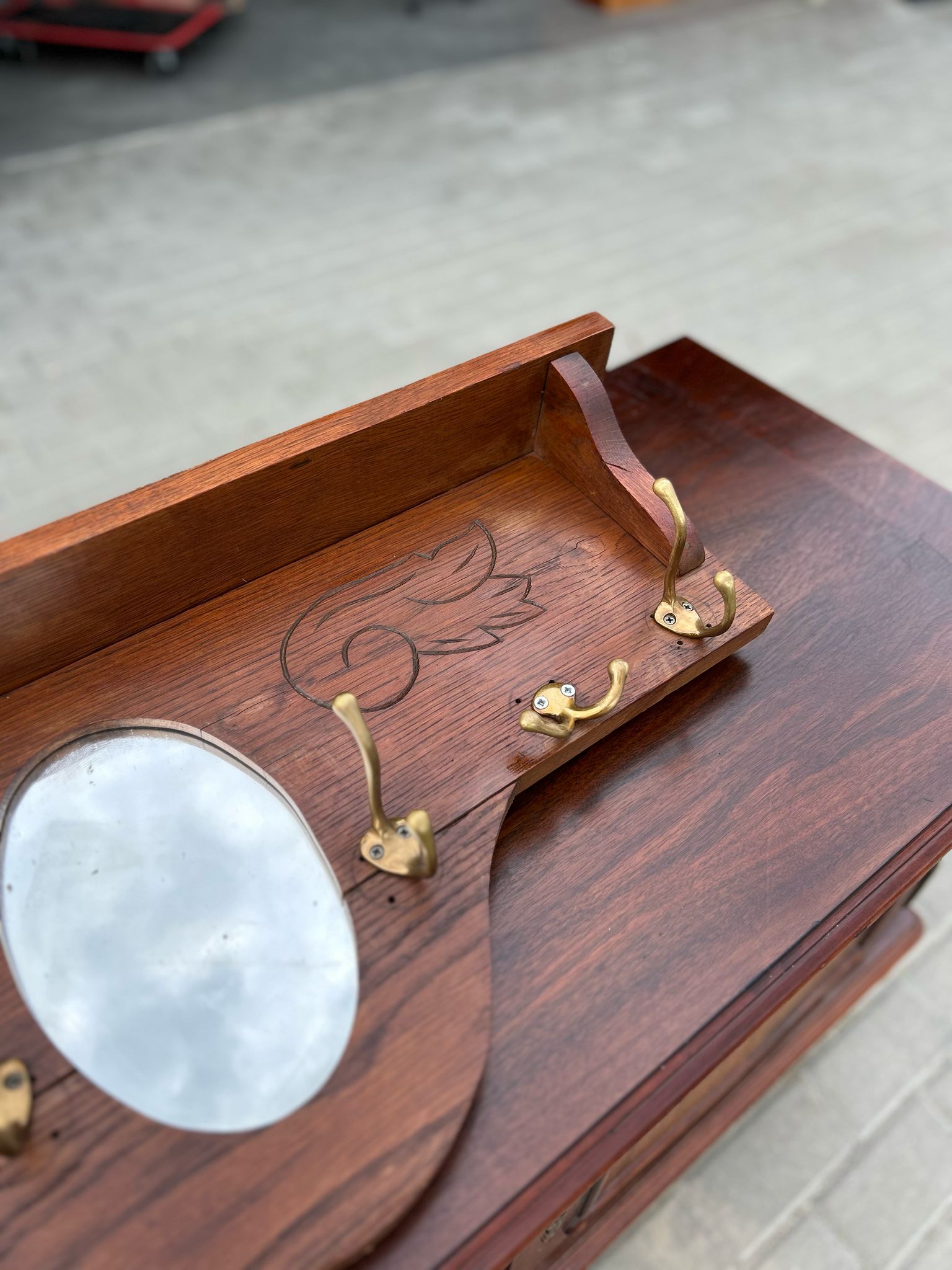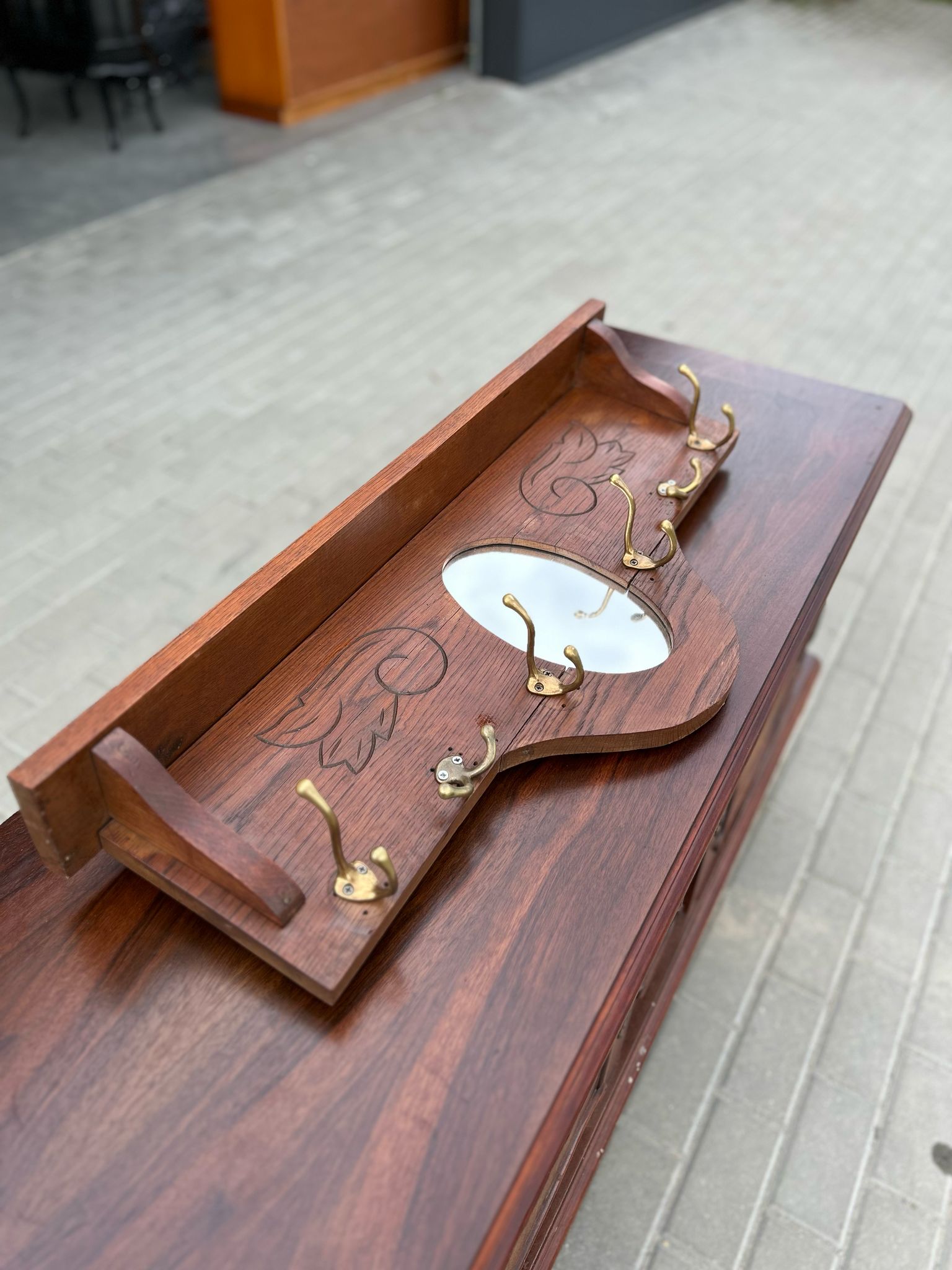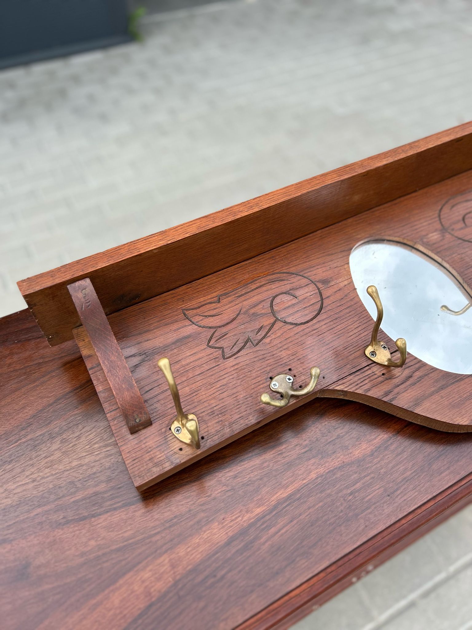 🪞 Drewniany wieszak z lustrem i grawerem kwiatowym.