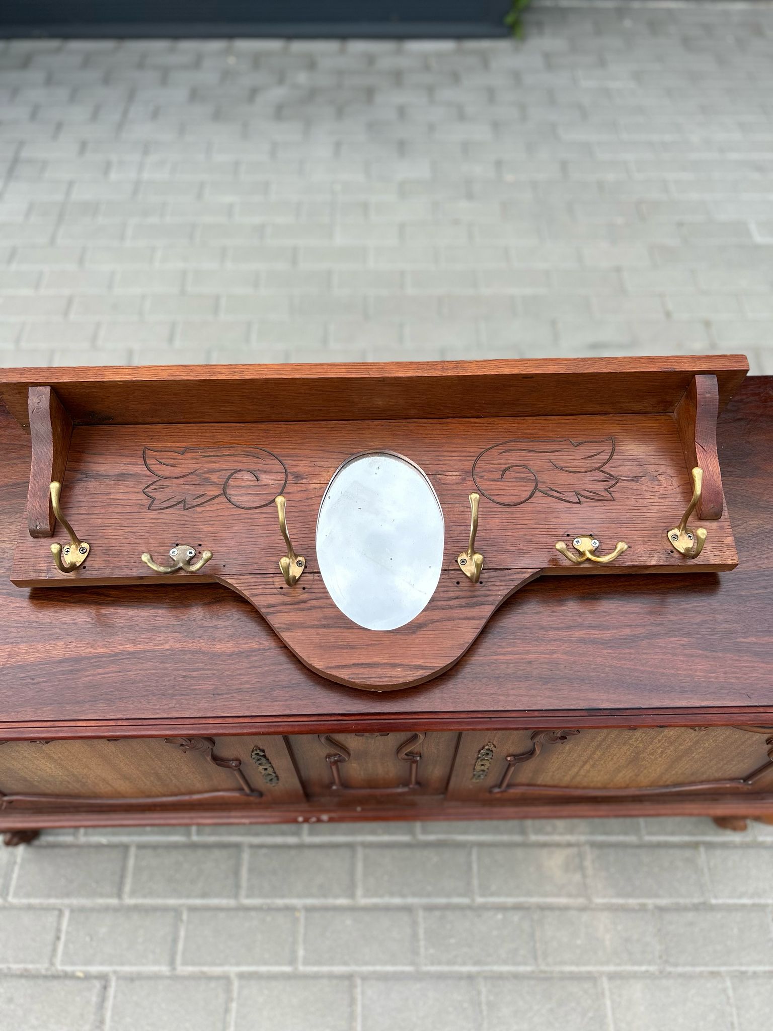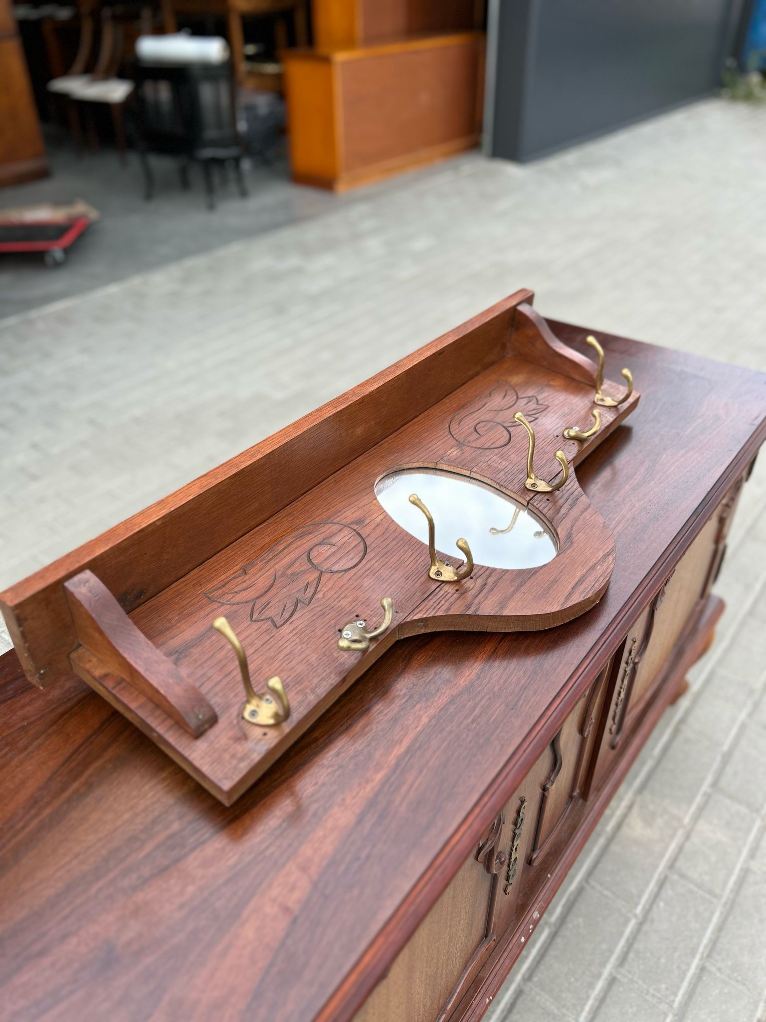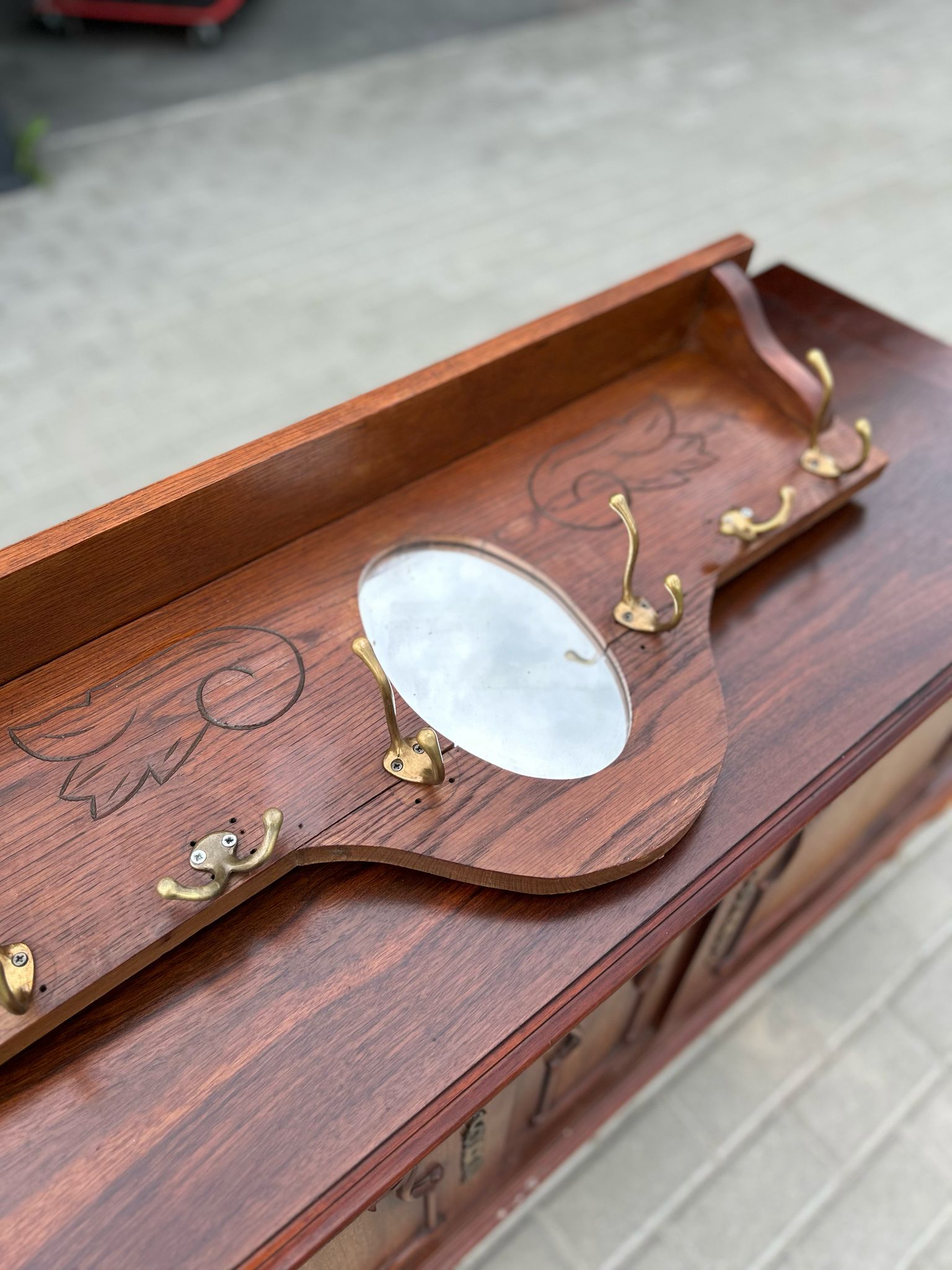 🪞 Drewniany wieszak z lustrem i grawerem kwiatowym.