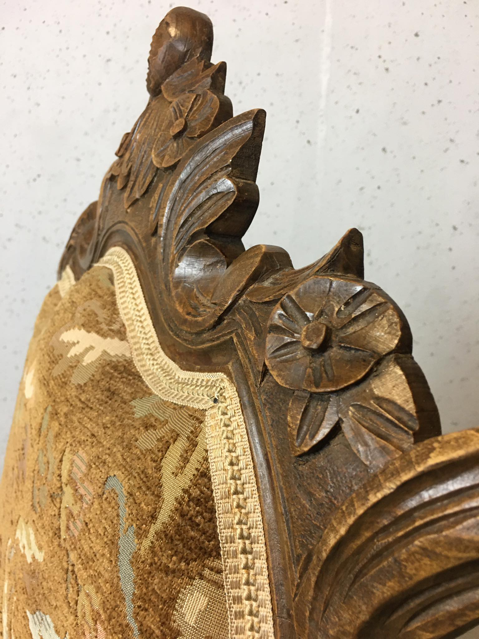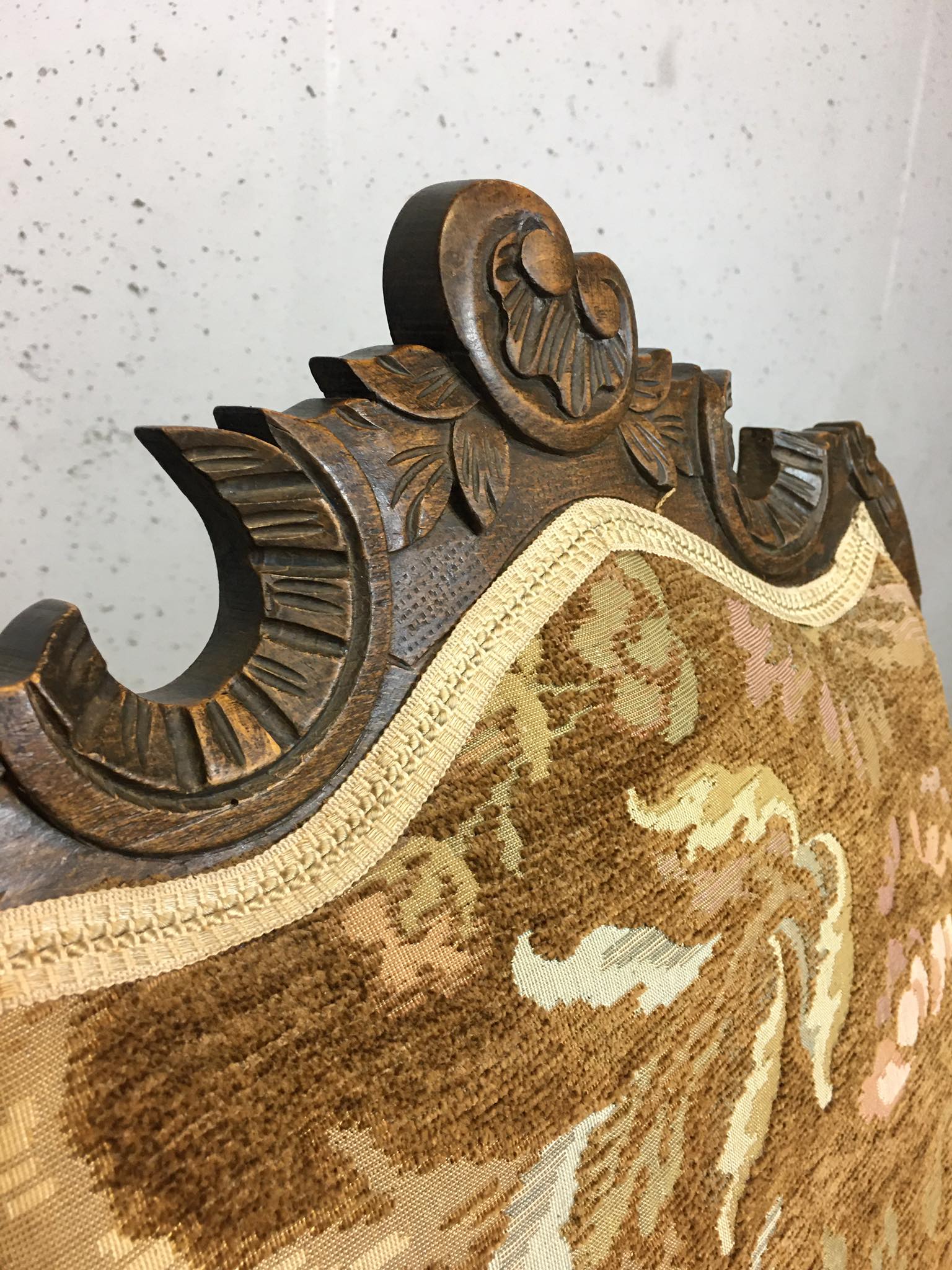 Szczyt zaplecek zdobią rzeźbione elementy.