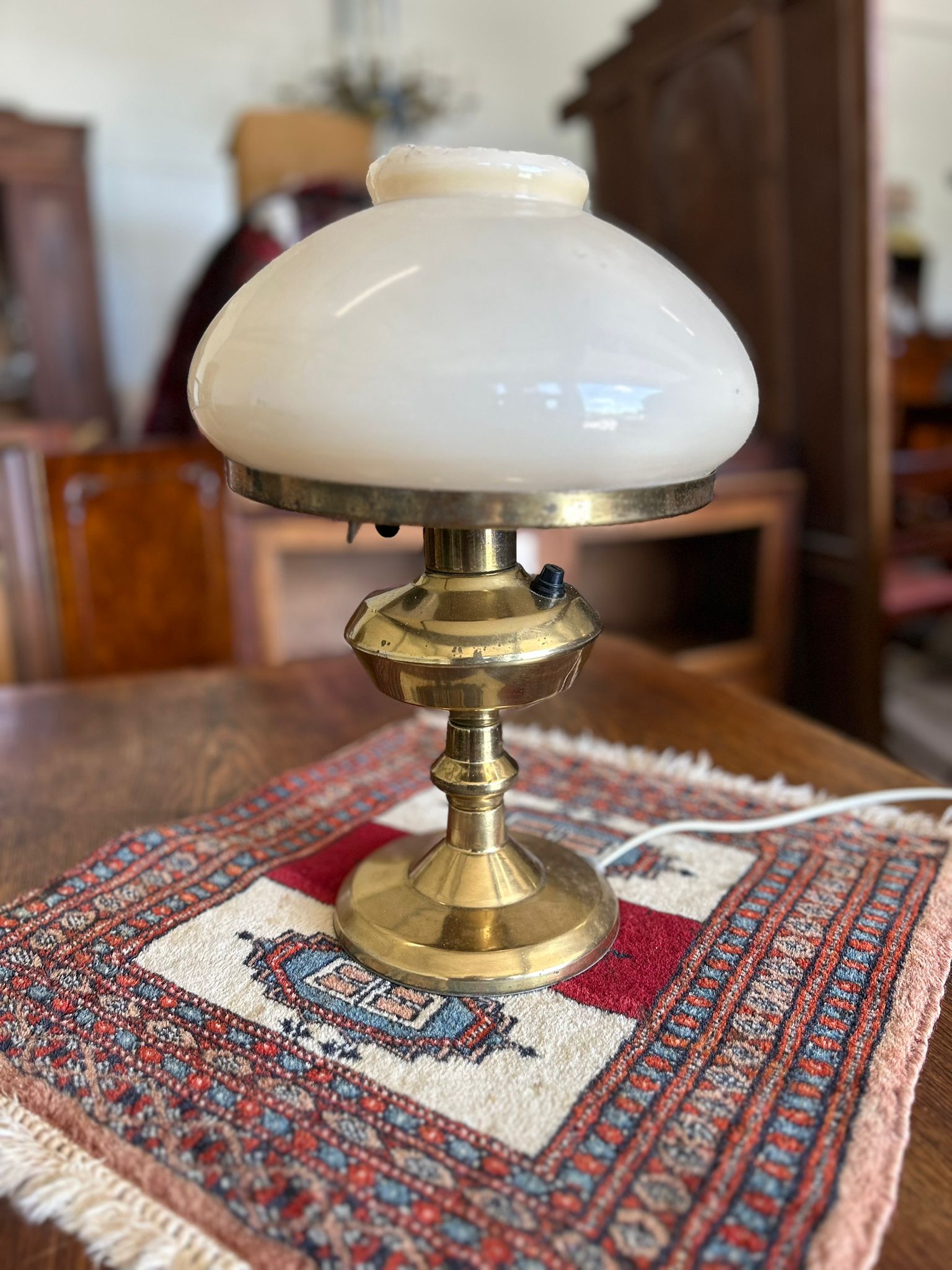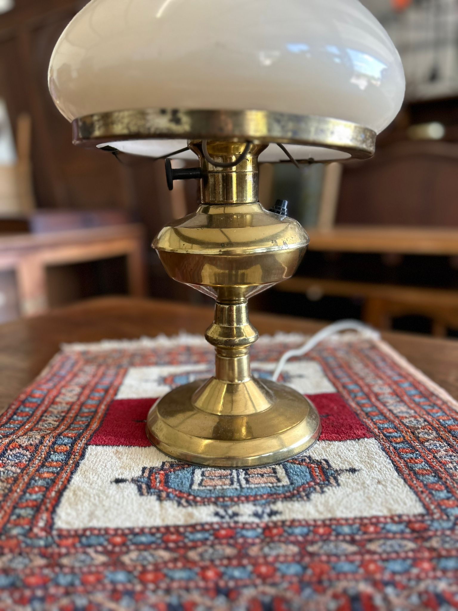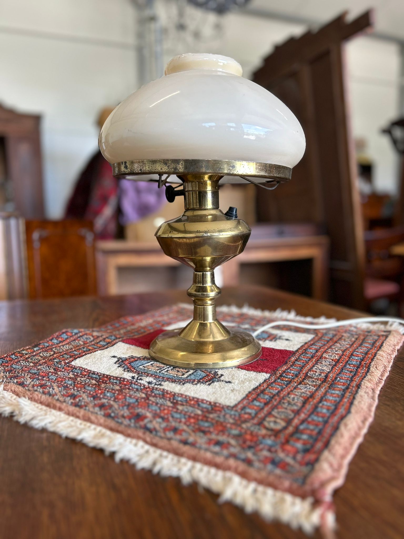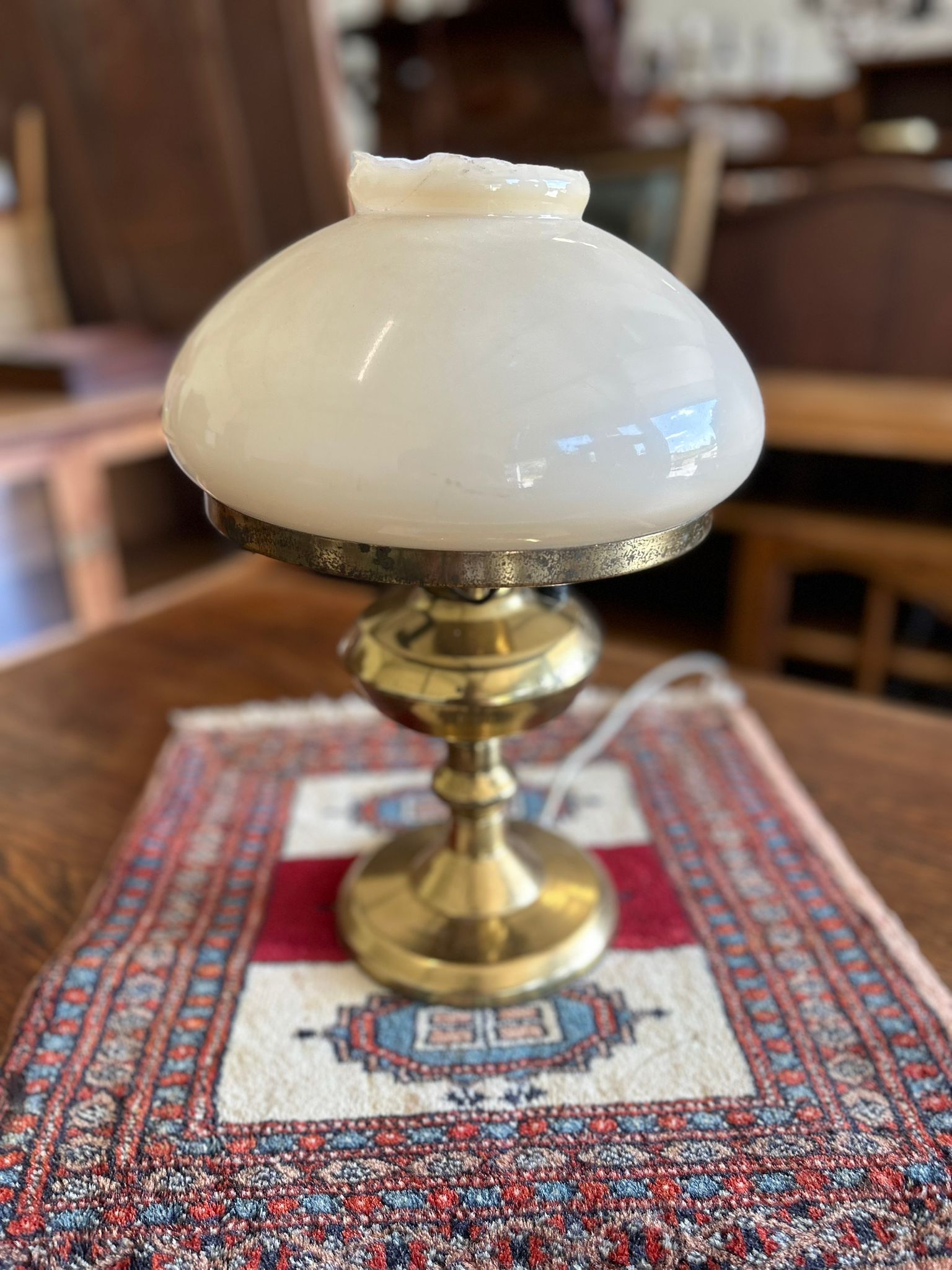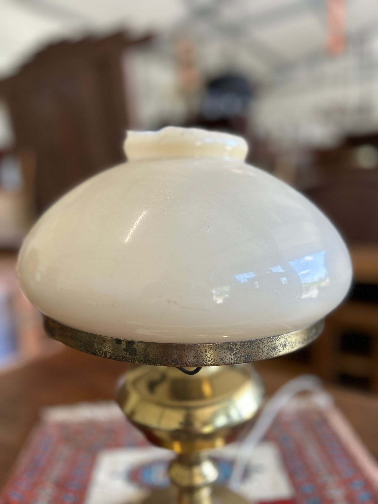 🕯️ Klasyczna lampa stołowa z mosiężną podstawą i mlecznym kloszem