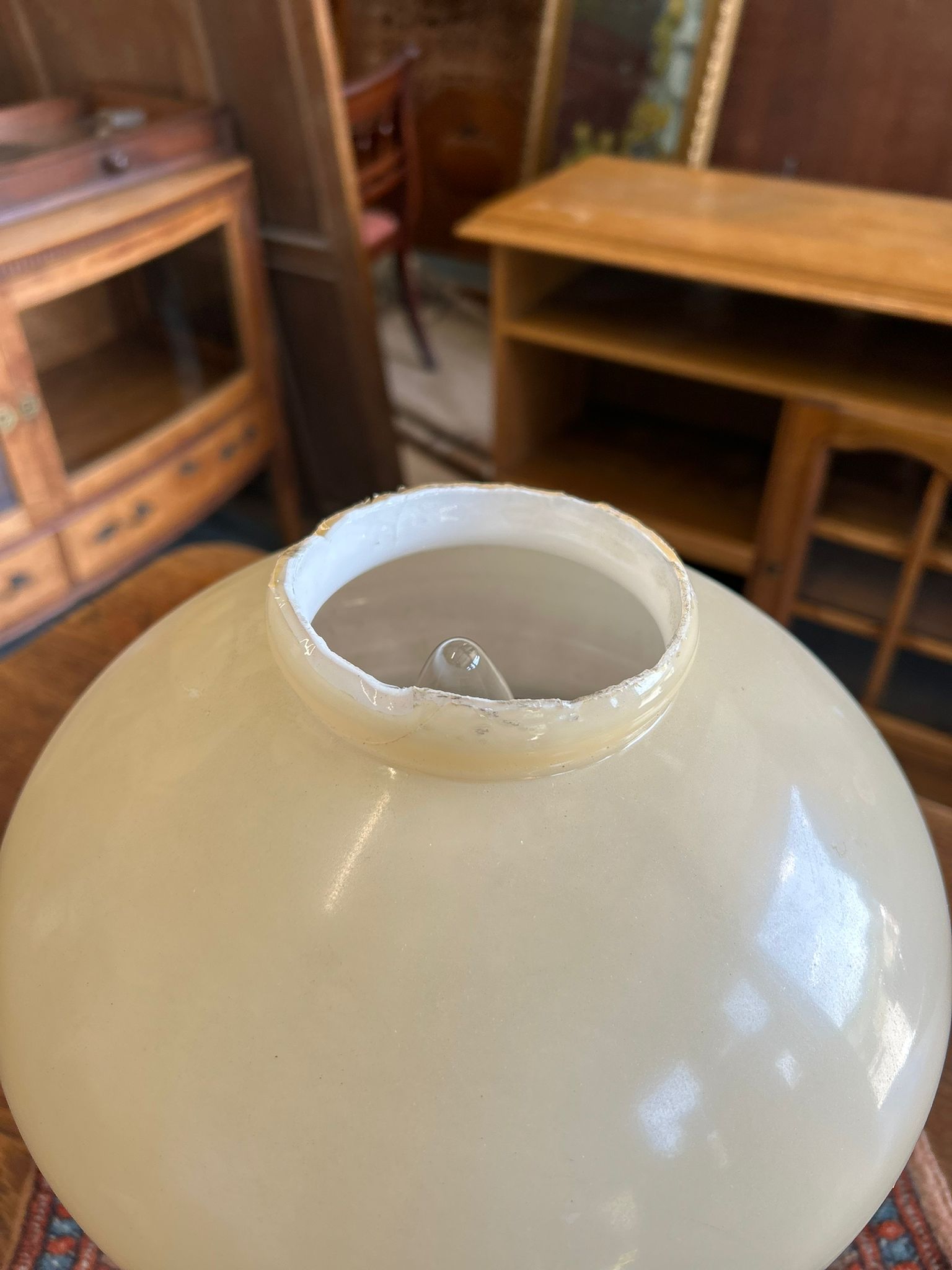 Górna część klosza jest uszczerbiona, defekt widoczny jest na zdjęciu.