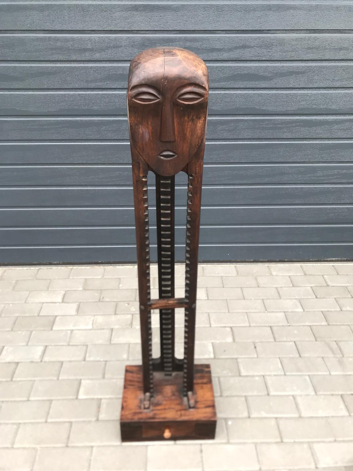 Podstawa rzeźby to stabilny prostokątny element z jedną szufladką.